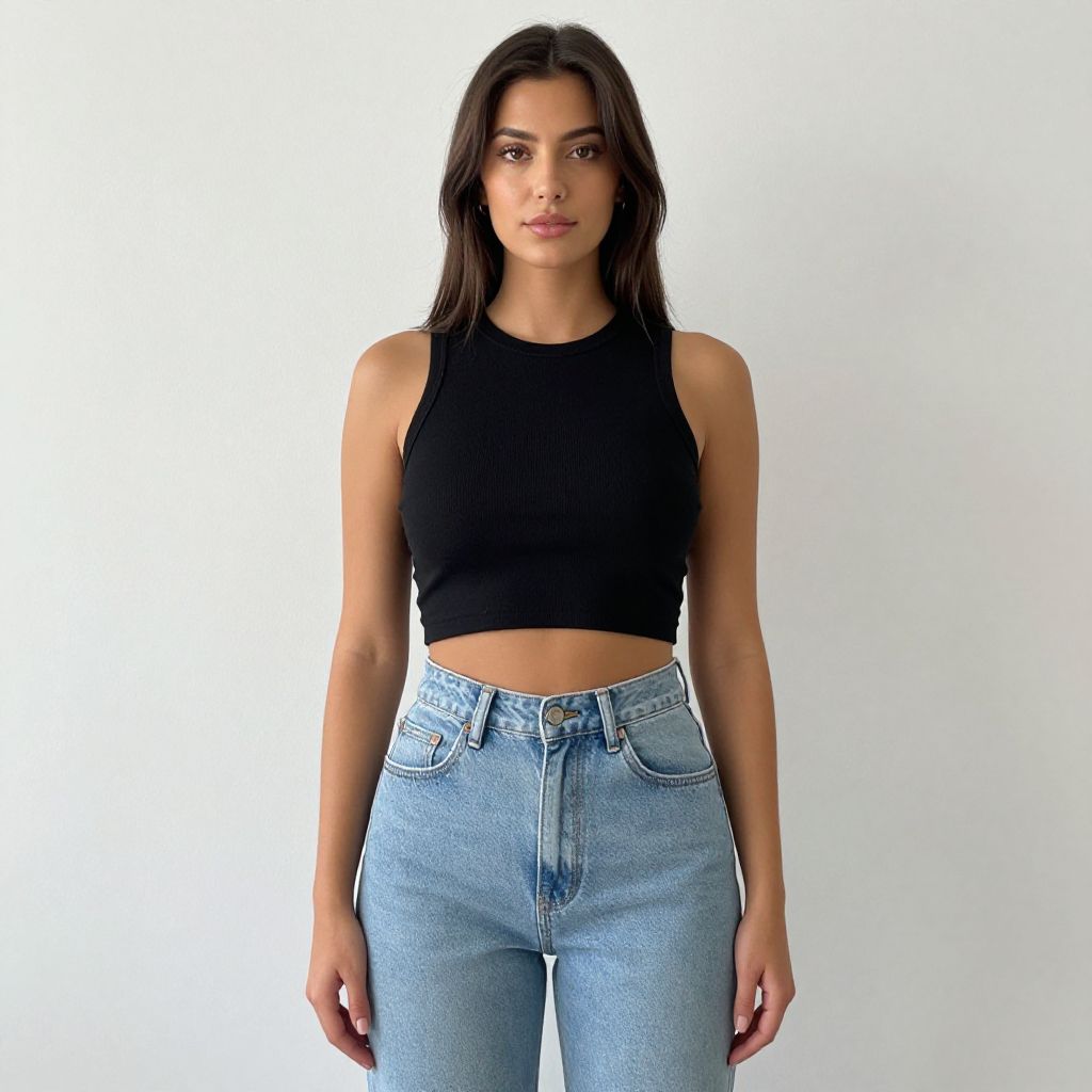Photograph of a young woman with medium brown skin and long, straight dark brown hair standing against a plain white background. She has a slender build and is wearing a black, sleeveless crop top that reveals her midriff, and high-waisted, light blue denim jeans. Her expression is neutral, and she is looking directly at the camera. The lighting is even, highlighting her facial features and clothing textures. The overall style is minimalistic and modern.