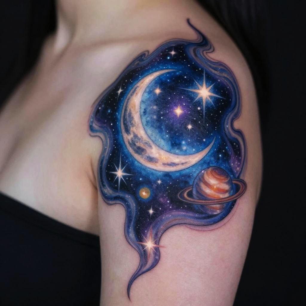 Tattoo prompts inspired by celestial elements, illustrating a cosmic scene with stars, planets, and a crescent moon, rendered in deep blues and purples with glowing highlights, perfect for a shoulder or chest piece with a mystical atmosphere.