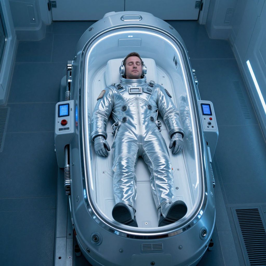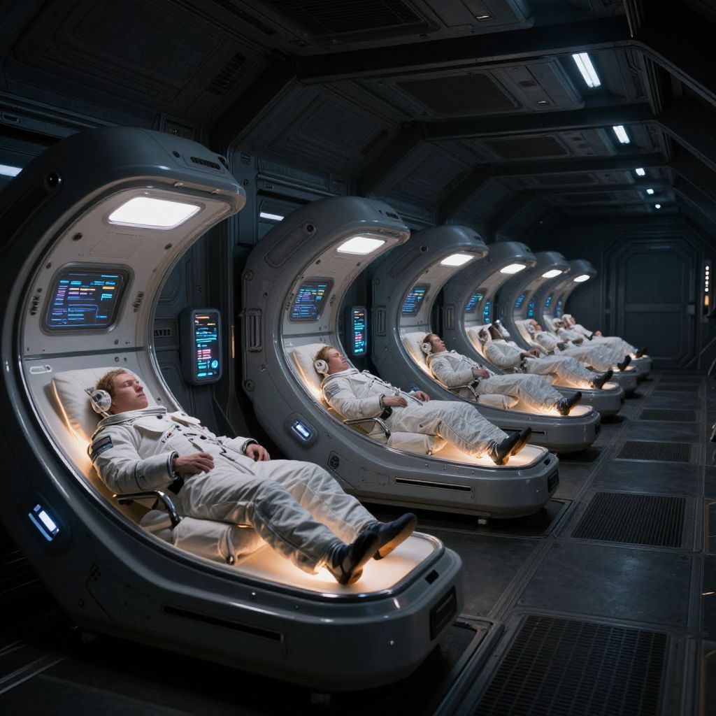Photograph of six astronauts in white space suits, sleeping in futuristic, curved, illuminated bunks within a dark, sleek spaceship.
