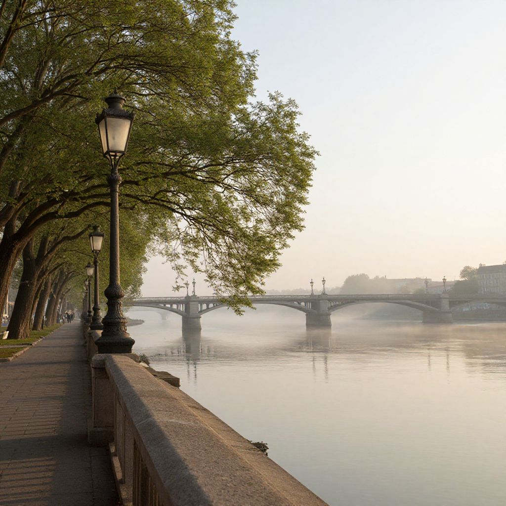 Rousse riverside promenade with vintage-style streetlights, leafy trees fluttering in a gentle breeze, reflections in calm waters, elegant bridges arching over the Danube, early morning mist casting a mystical ambiance over the tranquil scene.
