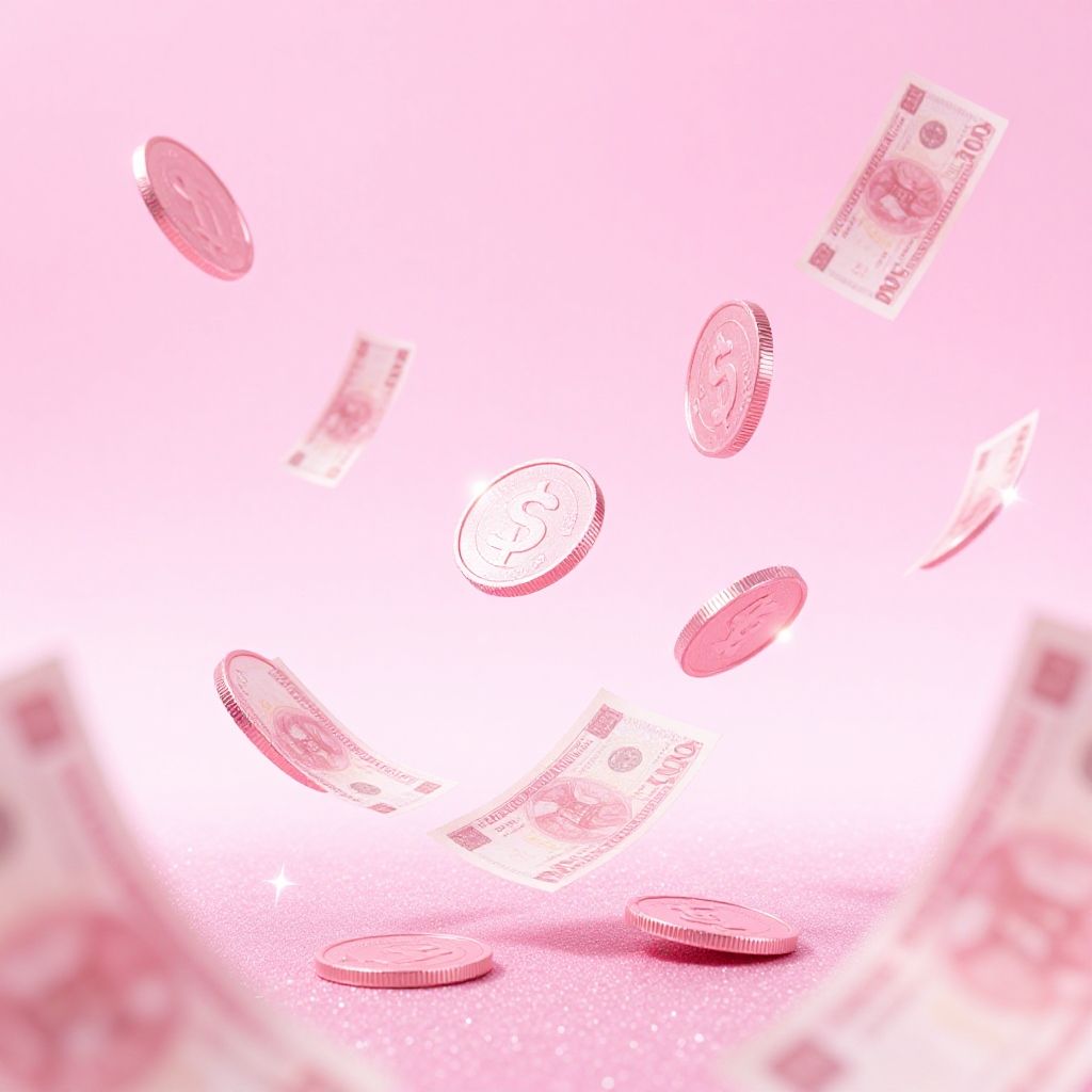 Sparkly pink money background with glowing pink coins and notes floating gently on a sparkling gradient backdrop, accented by bright glints and twinkles, evoking a sense of richness and playful elegance in a futuristic style.