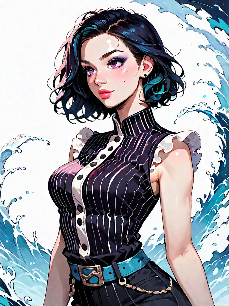 1girl, woman wearing sleeveless tailored wide-leg jumpsuit with vertical pinstripes, wrap-front bodice and matching waist tie belt in deep forest green with pale beige stripes on tall woman with long hair cascading over one shoulder posed one hand in pocket and the other resting on her hip in sunlit wall with leafy shadows cast across the surface, coppery evening light with mild lens flare, cinematic editorial fashion photography, high resolution, ultra-detailed
