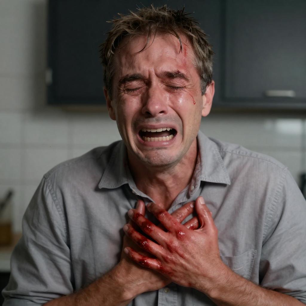 Photograph of a middle-aged man with short, wet, light brown hair, crying and screaming with his eyes closed. He has blood on his face, shirt, and hands. He clutches his chest with both bloody hands. Dark background with white tiled wall and black cabinet. Intense facial expression.