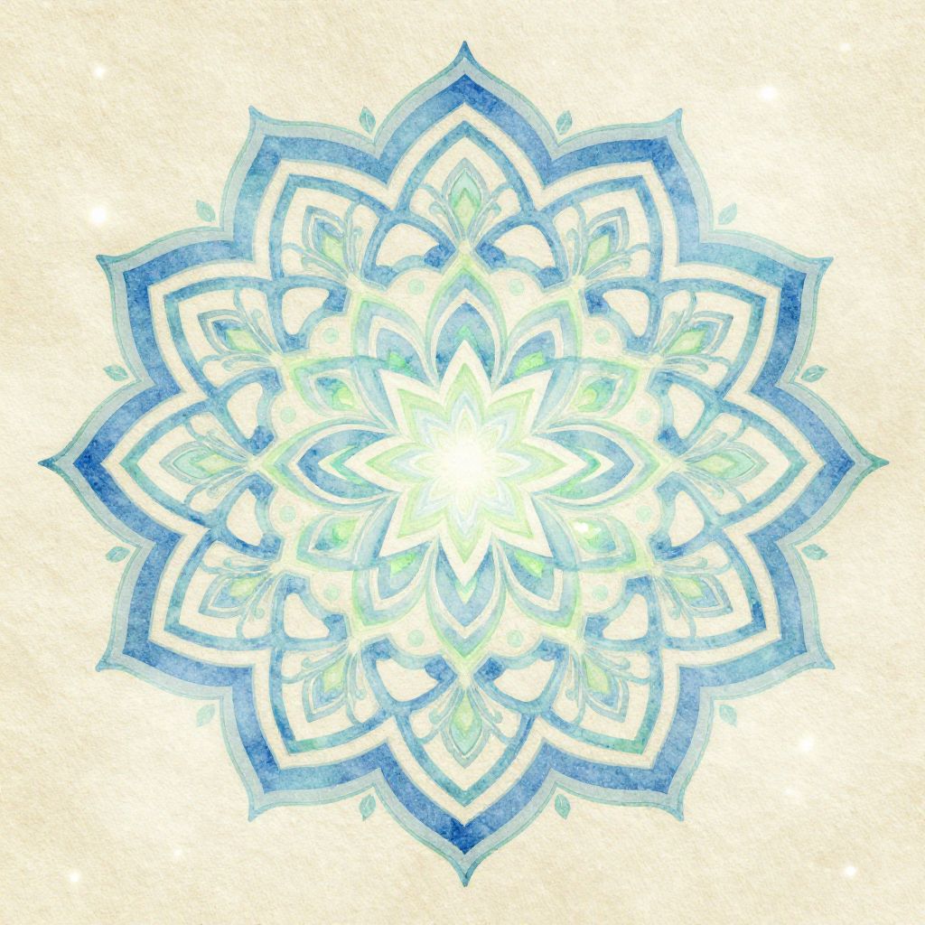 A digitally painted mandala featuring symmetrical patterns in calming blues and greens. The design radiates harmony and balance, set against a textured parchment background with subtle glowing accents, creating an elegant and soothing visual effect.