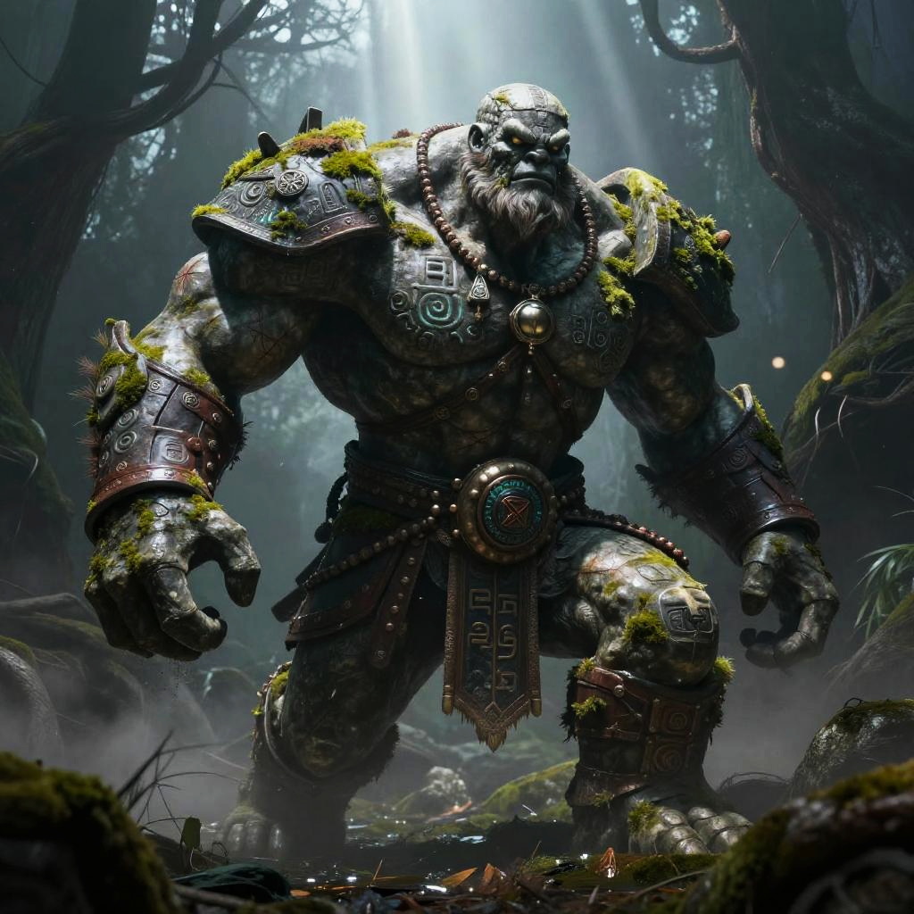 Giant stone golem encrusted with moss and ancient glowing runes striking a heroic pose in fog-shrouded swamp with drifting roots and dim ambient light, muscles taut and defined, fur or skin shimmering under harsh light, battle scars prominent, adorned with warrior regalia and talismans, heat haze and drifting grit, god rays and volumetric beams, epic and powerful atmosphere, ultra-detailed textures on fur, skin, metal, and leather, micro-scratches and weathering, dynamic foreground elements, long dramatic shadows, dark fantasy photorealism with eerie volumetric lighting and rich texture.