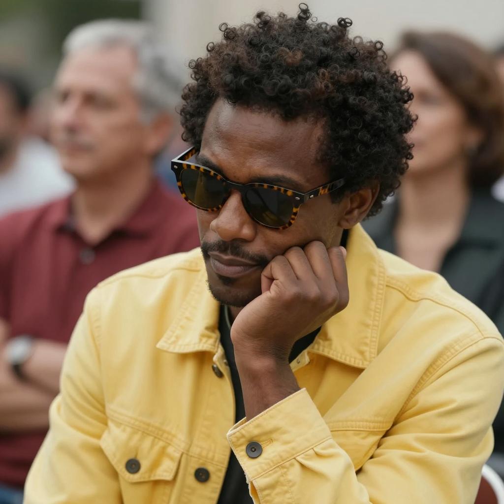 Portrait of a dark-skinned man with curly black hair wearing large tortoiseshell sunglasses and a bright yellow jacket. He is resting his chin on his hand, looking downward with a contemplative expression. The background is blurred and shows a gray-haired man in a red shirt and another person with brown hair.