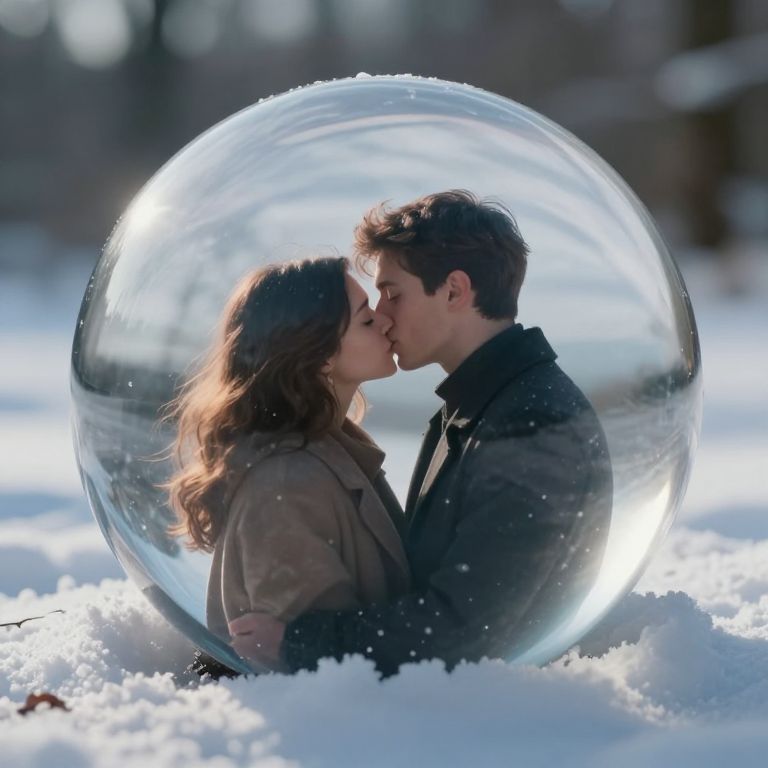 Enchanted lovers embrace within a luminous, reflective orb, their tender moment suspended in a winter wonderland where reality blurs into a dreamlike, timeless embrace.