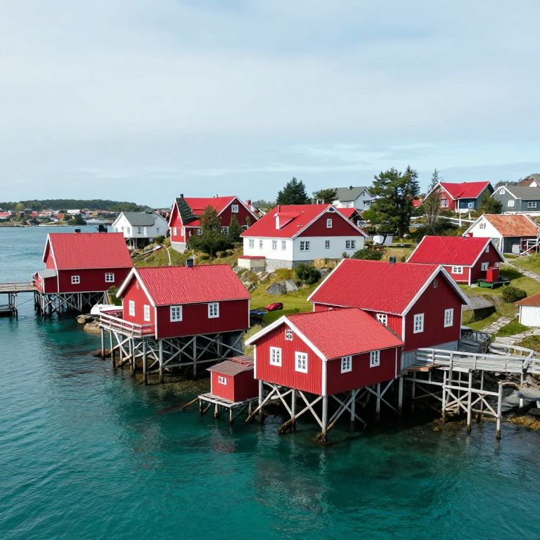 A quaint village of red-roofed houses perches atop a floating island, its underside revealing an intricate network of layered docks and hanging structures that extend deep into the serene turquoise waters below.