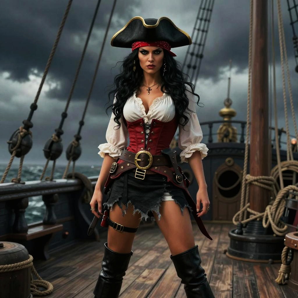 Digital artwork of a fierce, black-haired pirate woman with large breasts, wearing a maroon bandana, white blouse, and brown corset, holding