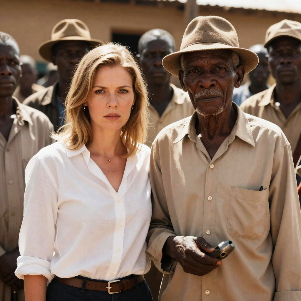 Photograph of a scene with two central figures: a serious white woman with shoulder-length blonde hair in a white blouse, and an elderly African man with a mustache, wearing a beige hat and tan shirt. Surrounding them are several men in varied clothing, including hats and jackets. Background includes a crowd and rustic setting. The elderly man stands close to the woman, holding a metal object. The woman's expression is intense, the man's is calm. Bright sunlight illuminates the scene.