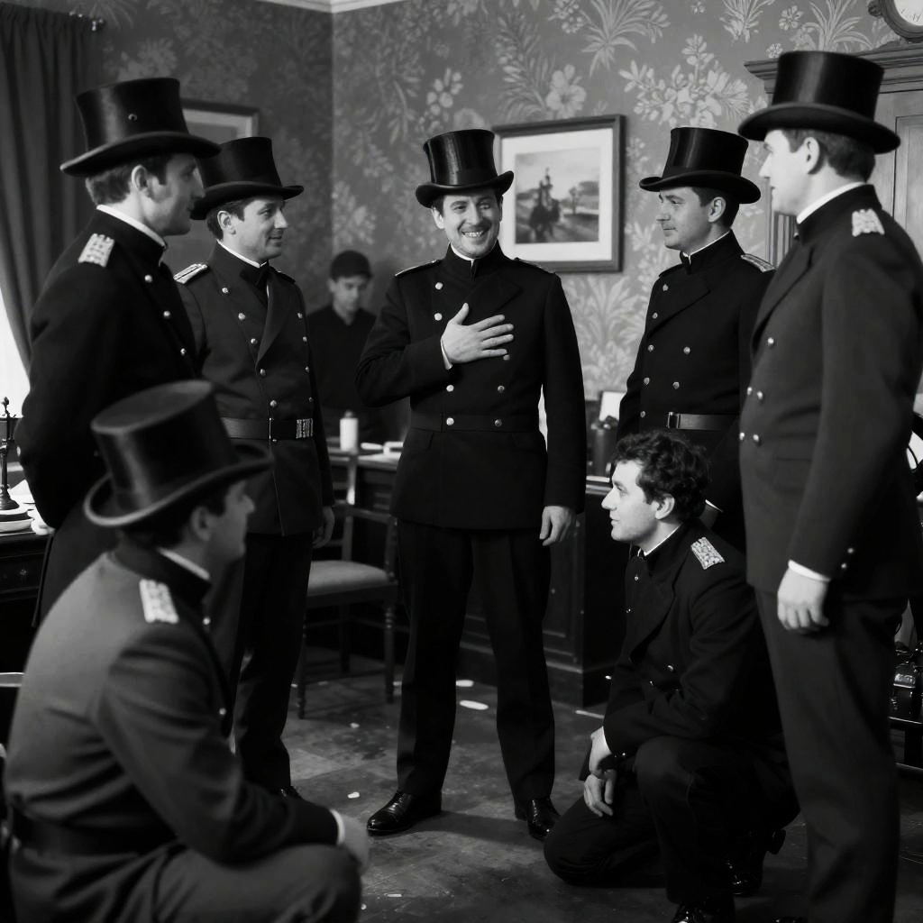 Black and white photograph of six men in early 20th-century attire, standing in a row, wearing fedoras and suits, facing left. They hold papers, standing in front of numbered placards ("2 Strait," "2 Place"). The background includes wooden paneling and windows. The men have neutral expressions.