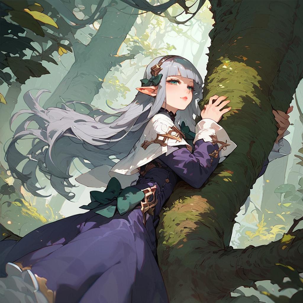 1girl, forest, behind tree, hairband, long hair, grey hair, pointy ears, blunt bangs, white capelet, purple dress, green bow, long sleeves, score_9, score_8_up, score_7_up, source_anime