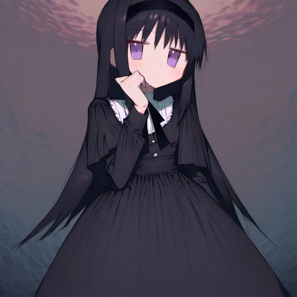 Illustration of a young anime girl with long black hair and purple eyes, wearing a black funeral dress with a white collar and a black hairband. The character is depicted in a contemplative pose against a muted purple background. The style is inspired by the character Akemi Homura from Mahou Shoujo Madoka Magica.