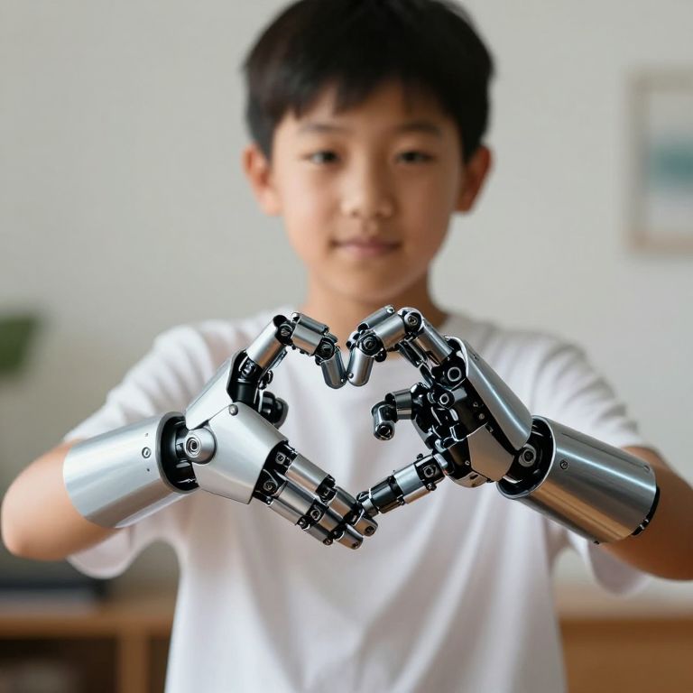 Josei :A 12 year boy arm and a bionic arm connecting, forming a heart, high depth of field, 8K, , pixar style,
