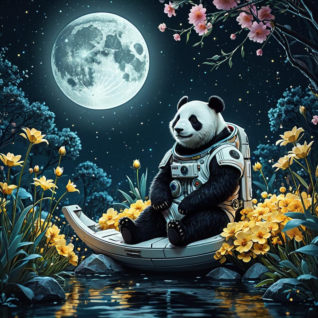 A detailed digital painting of a celestial fox with glowing cosmos-like fur, perched on a stone ledge within a floating nebula garden. The scene features vibrant pink flowers and swirling cosmic clouds with stars and celestial bodies in the background, rendered with intricate detail and sharp focus, embodying fantasy and magical themes.