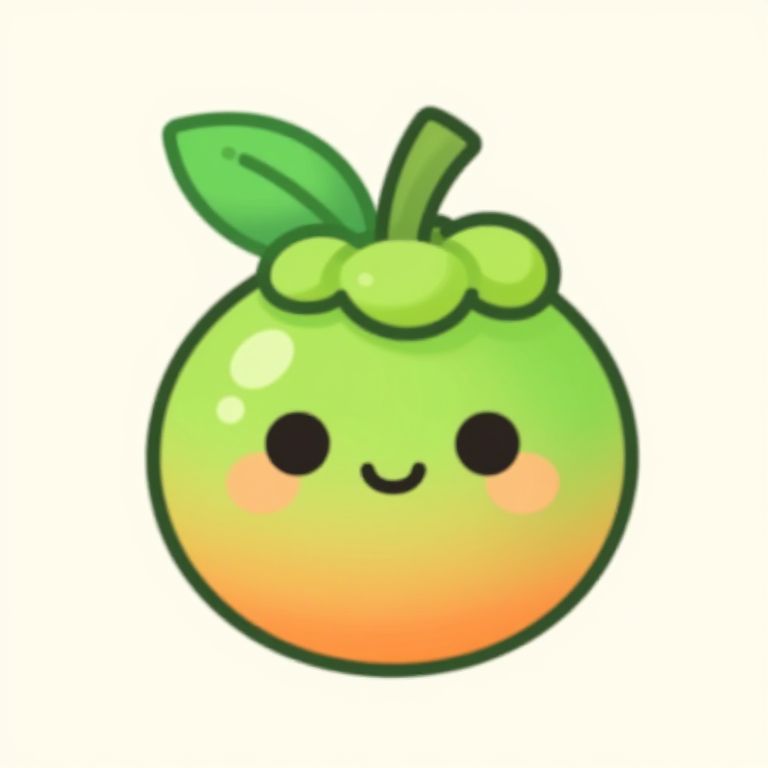 The image features a cute, kawaii-style illustration of a mangosteen, rendered in a minimalist and clean vector style. The mangosteen is depicted with a bright, cheerful expression, with large, round eyes and a small, smiling mouth. The fruit has a smooth, glossy texture, with a gradient of green and orange hues, giving it a vibrant and appetizing appearance. Two green leaves with a simple, linear design sprout from the top of the fruit, adding a touch of natural detail. The overall composition is simple and balanced, with the mangosteen centered against a soft, neutral background, creating a harmonious and pleasing visual effect. The illustration is designed to be a bright, cheerful wallpaper, with its bright colors and friendly character making it suitable for a wide range of applications.