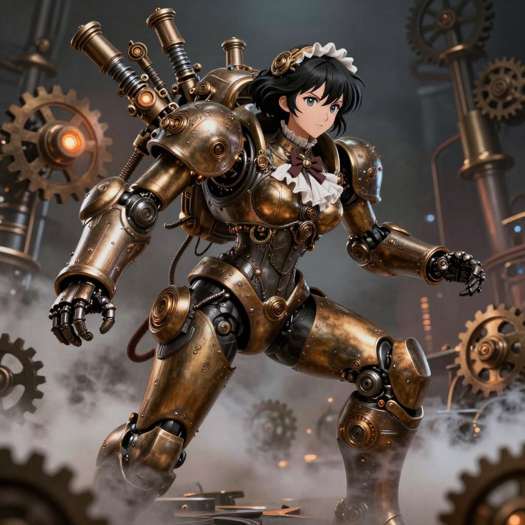 Anime steampunk girl piloting an ornate steam-powered mech suit, blend of Victorian fashion and futuristic technology, smoky industrial background with glowing gears and pistons, strong heroic stance, rich metallic textures and dynamic lighting effects.