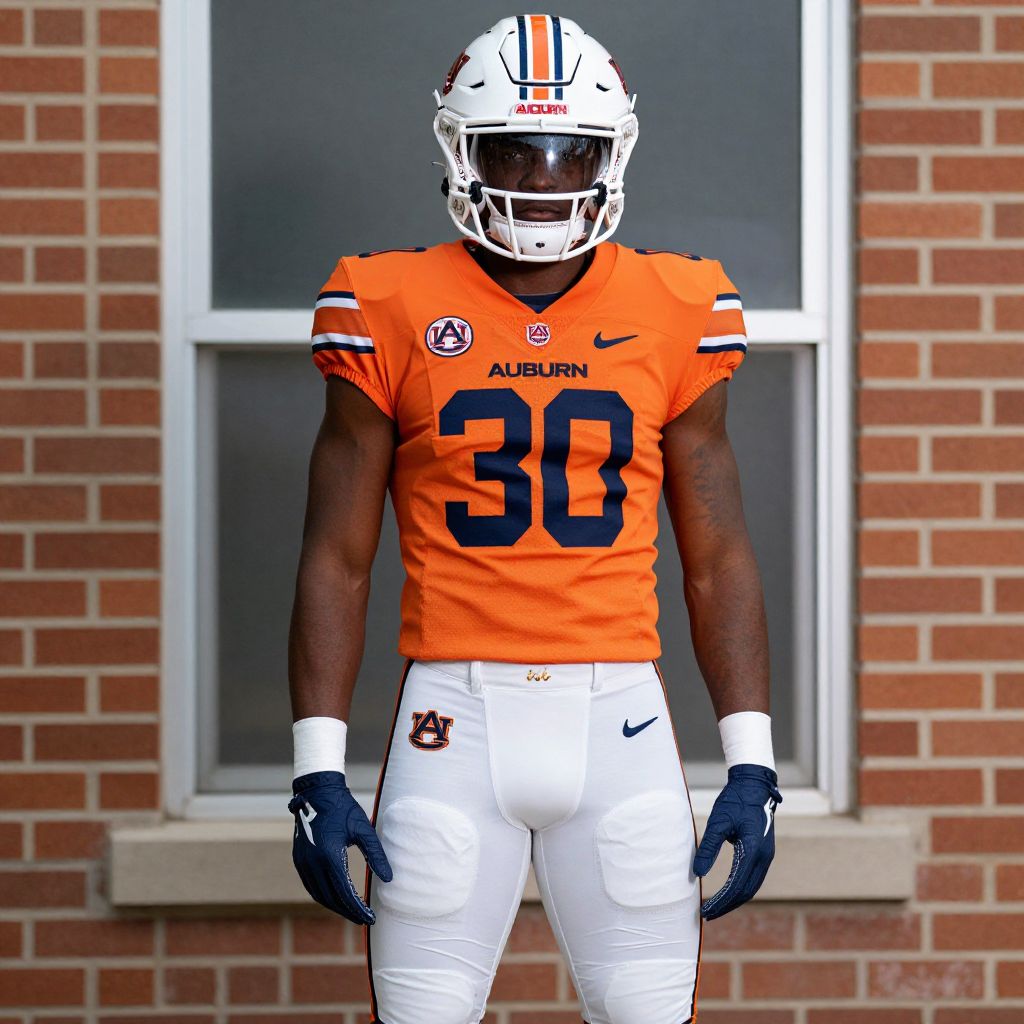 Auburn Football Costume, man in orange jersey and white pants standing in front of a window