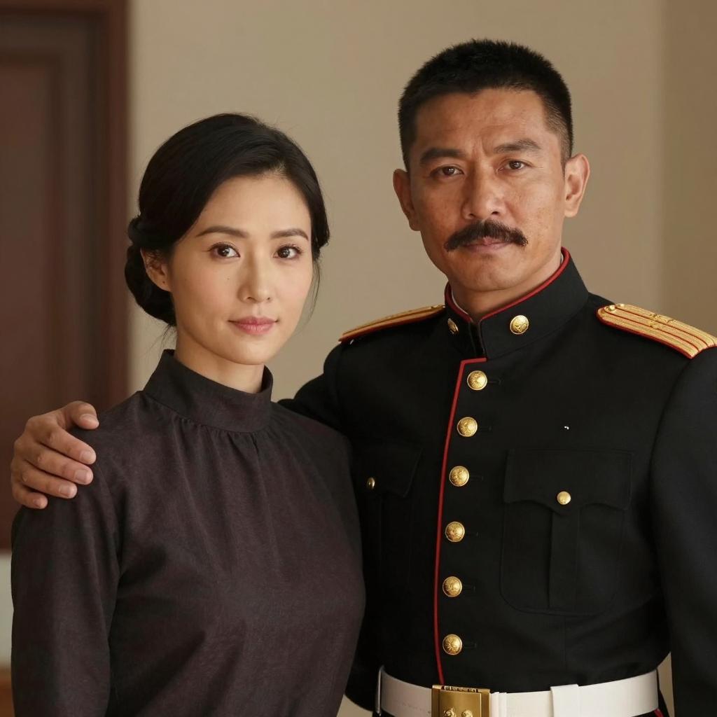 Photograph of a couple in military uniforms. Man with short dark hair, green hat with cross, brown jacket. Woman with short dark hair, white collar, smiling. Background: cloudy sky, soldier with rifle on snowy terrain. Man's arm around woman's shoulder, both facing forward. Bright sunlight.