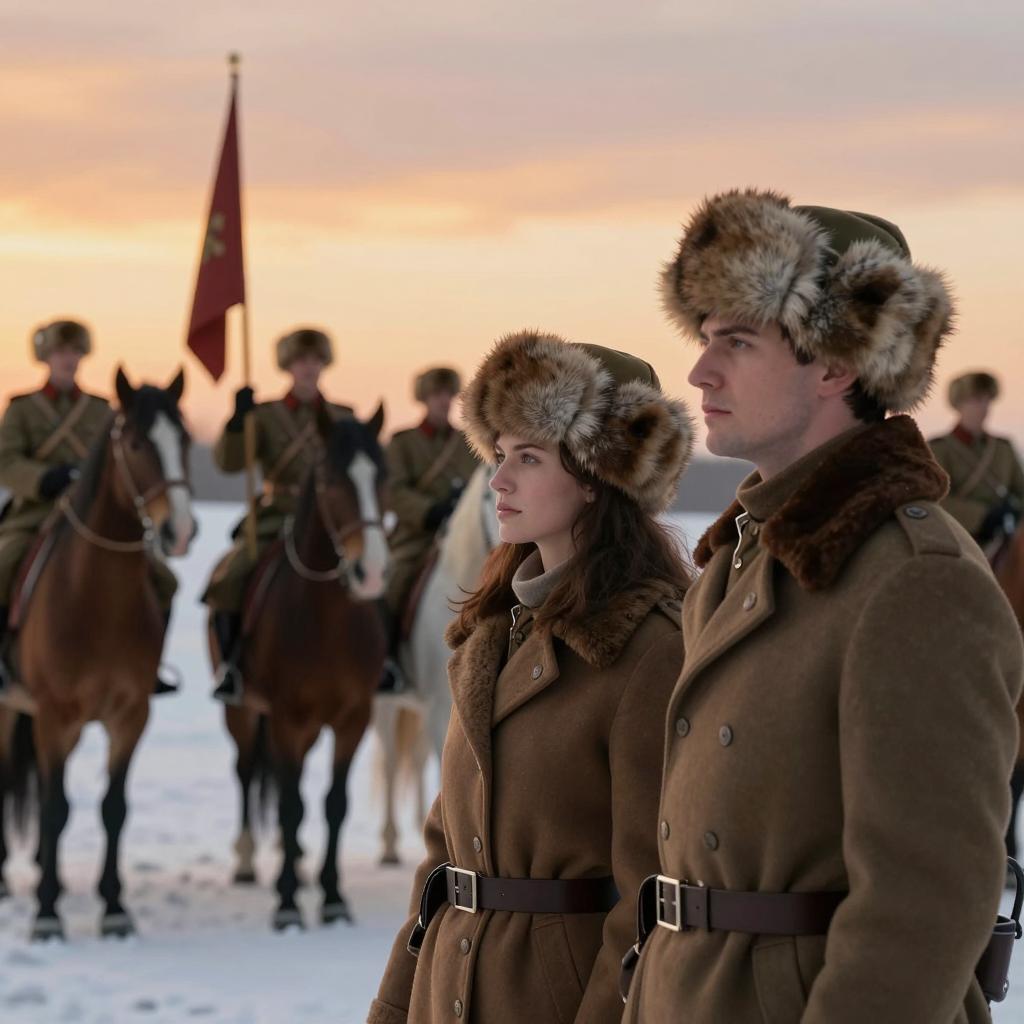 Portrait of a man and woman wearing olive green military uniforms with brass buttons and red insignia. The man, with short dark hair and a green side cap featuring a cross, has his arm around the smiling woman who wears a white collar under her jacket. In the background, a soldier holding a rifle stands on snowy terrain under a cloudy sky. Bright daylight illuminates the scene.