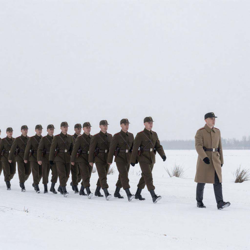 Photograph of a wartime scene. Soldiers in military uniforms and hats, some wading, others standing, amidst dense smoke and explosions. Large plume of dark smoke rises in the background. Bright yellow banner in the foreground. Numerous soldiers, intense expressions. Blue sky partially visible. Ships and debris in the distance.