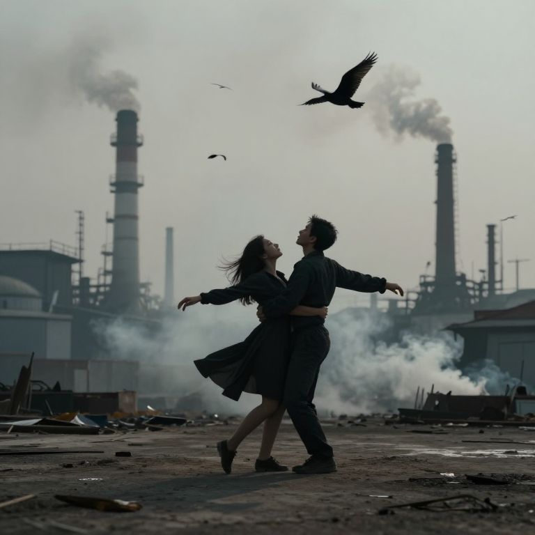 A photograph depicts a silhouetted couple dancing in an industrial wasteland with smoke billowing from tall chimneys in the background. The woman, with long hair, wears a flowing dress, while the man, with short hair, dons a dark jacket and pants. Birds fly above them, and debris is scattered on the ground. The scene is backlit by a pale, overcast sky, creating a dramatic, melancholic atmosphere. The couple's dynamic, outstretched poses contrast with the desolate, industrial setting.