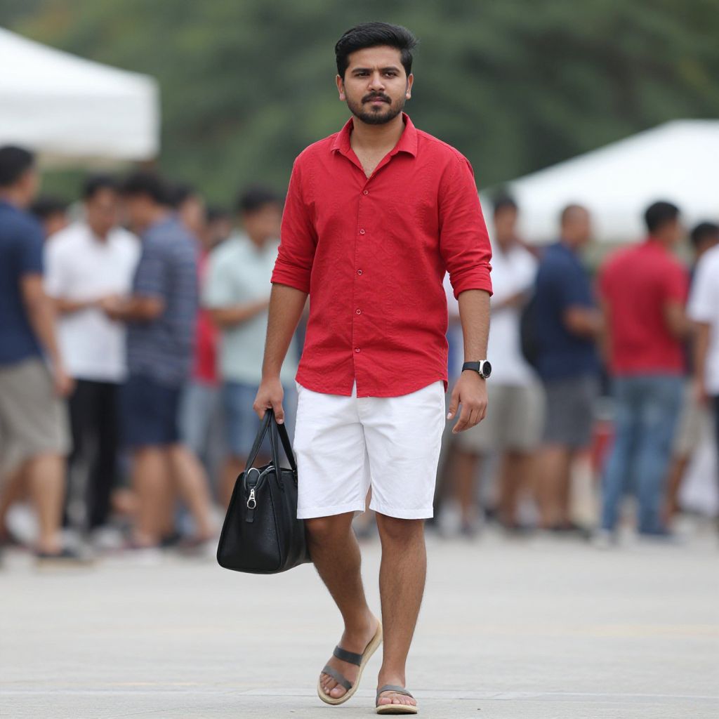 Summer party outfit man, 1boy, male focus, facial hair, watch, wristwatch, shirt, blurry, beard, outdoors, black hair, full body, white shorts, shorts, mustache, solo, red shirt, blurry background, standing, bag, solo focus, walking, shoes