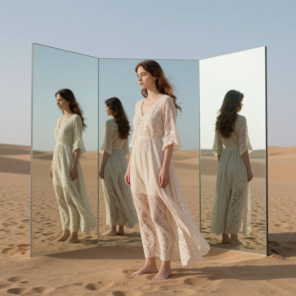 In a surreal desert landscape, a woman in a delicate lace dress stands amidst three reflective mirrors, each capturing her mirrored self in a crystalline, high-definition tableau that blends reality with the ethereal, evoking a timeless, dreamlike quality reminiscent of conceptual art.