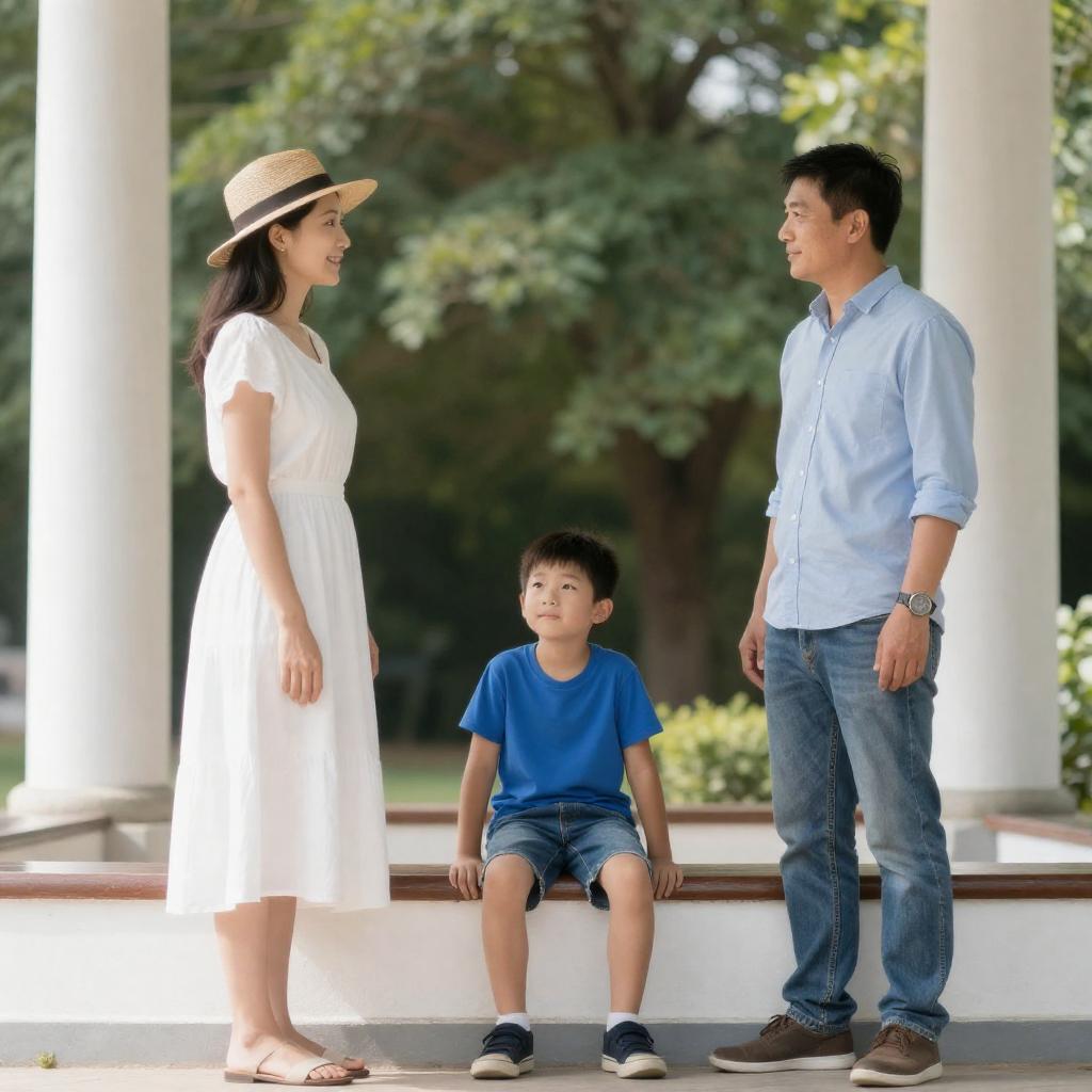 Photograph of three Asian men, two adults and a child, standing closely together indoors. The adult on the left wears a white shirt, the adult on the right wears a brown jacket, and the child in the center has short black hair and a dark shirt. They are smiling and looking at a blue smartphone held by the child.