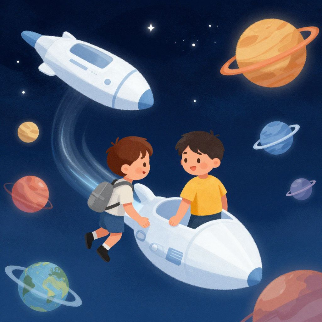 Illustration of two young boys playing and exploring space with white toy spaceships, surrounded by colorful planets and stars, evoking curiosity and imagination in a children's book style.