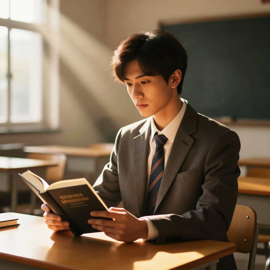 Book Character Costume Male Teachers, man in a suit and tie sitting at a table with a book --sref 1404