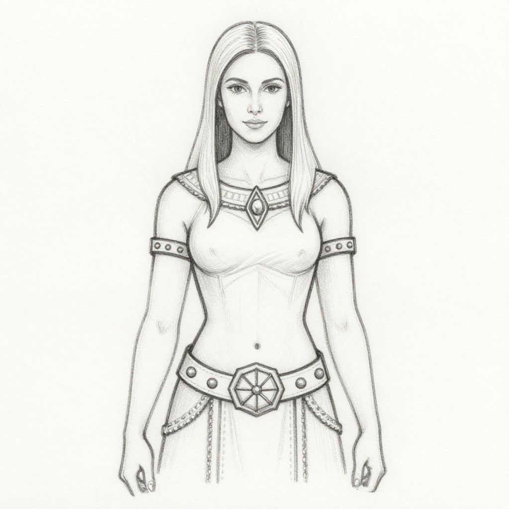 Black-and-white digital sketch of a confident, long-haired woman with a pentagram belt, arm bands, and a diamond necklace, standing front-facing.
