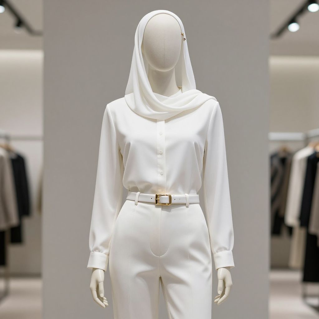 A mannequin standing in a modern, minimalist store setting, wearing a sleek white outfit with a fitted white blouse, straight white pants, and a white headscarf that gently falls over the shoulders, secured with a delicate gold hairpin. The outfit is tailored and elegant, with a white belt featuring a polished gold buckle that adds a touch of sophistication. The mannequin has a neutral, serene expression, with smooth, featureless skin and a quiet, still posture, embodying a sense of timeless elegance and clean design. The background is softly lit with soft white and gray tones, emphasizing the simplicity and purity of the outfit.