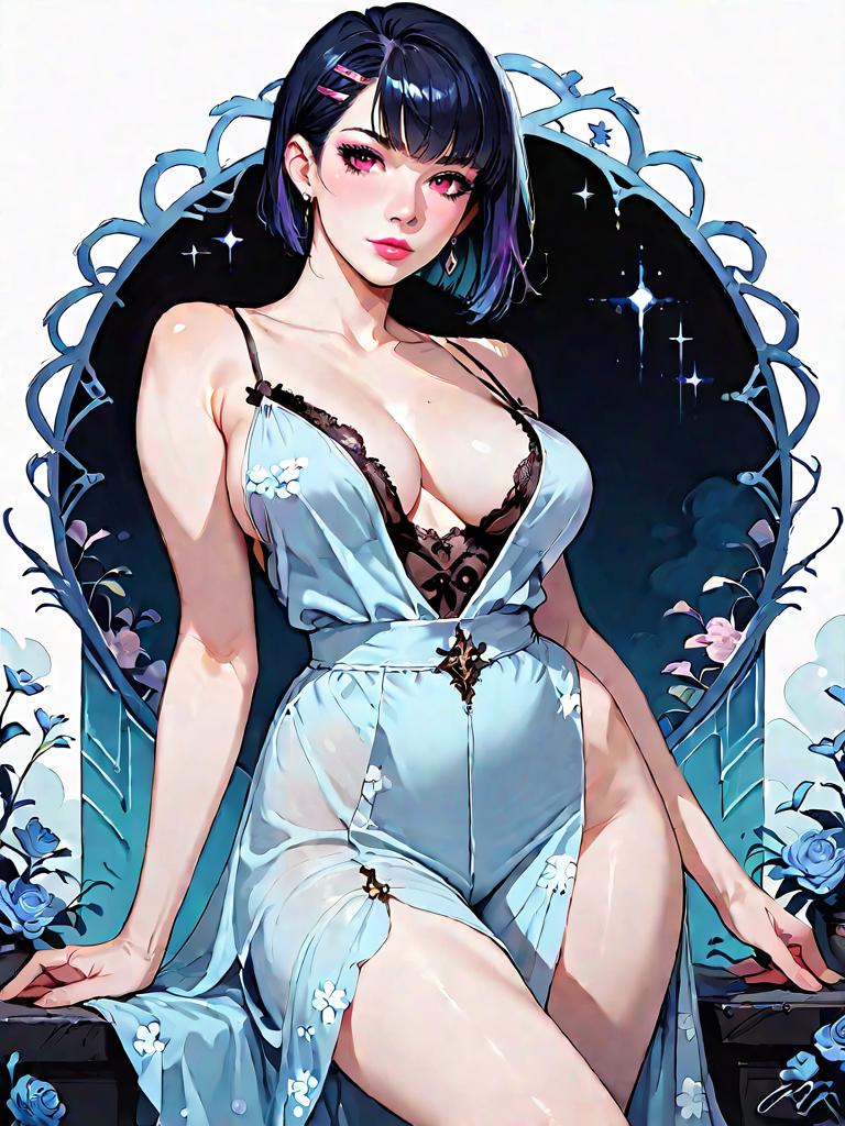 Digital illustration of an anime-style girl with short dark purple hair and pink eyes, kneeling on a pastel-colored surface. She wears a high-waisted crochet swimsuit in light blue with delicate lace detailing and a breathable, long-sleeve black beach coverup with oversized fit and intricate fringe accents. The background features soft clouds and stylized pink flowers, evoking a dreamy, dark fantasy seaside atmosphere.