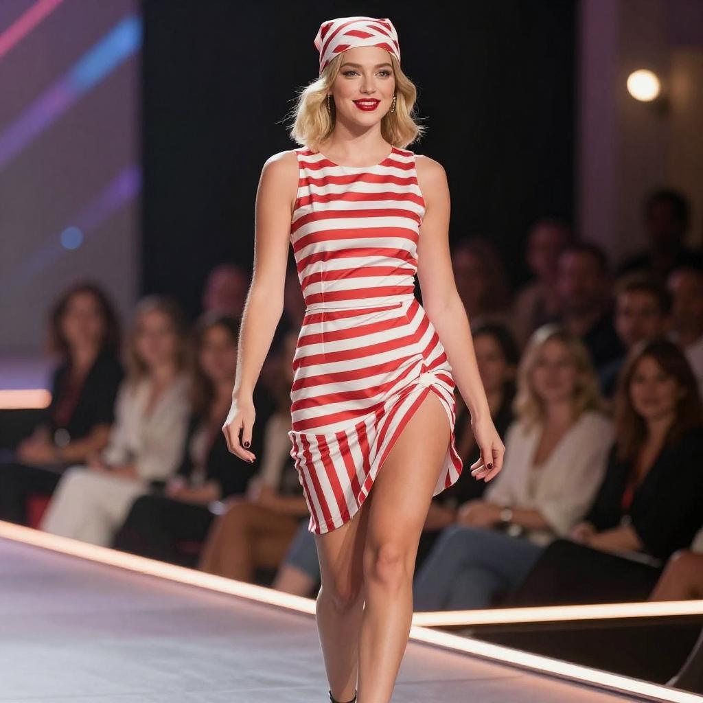 Digital image of a blonde woman with fair skin, wearing a red and white striped dress and matching headscarf, walking confidently on a stage. She has red lipstick and a cheerful expression. The background shows a blurred audience and stage lights. Her dress is sleeveless with a high slit, and she has a slim, curvy physique.