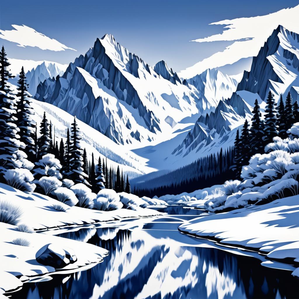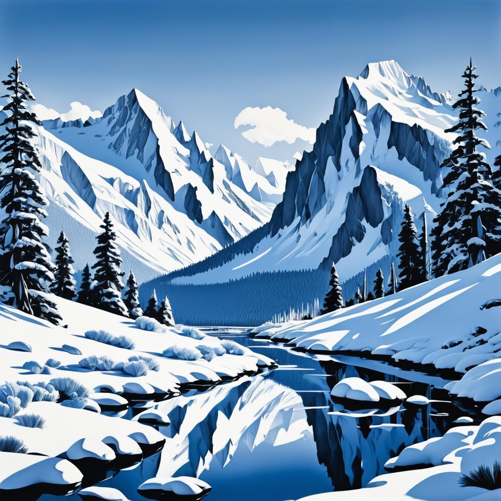 Detailed digital illustration of a snow-covered mountain range featuring sharp peaks, dense pine trees, and a calm river reflecting the snowy landscape. The scene captures a serene and tranquil winter environment with clear blue skies and scattered clouds.