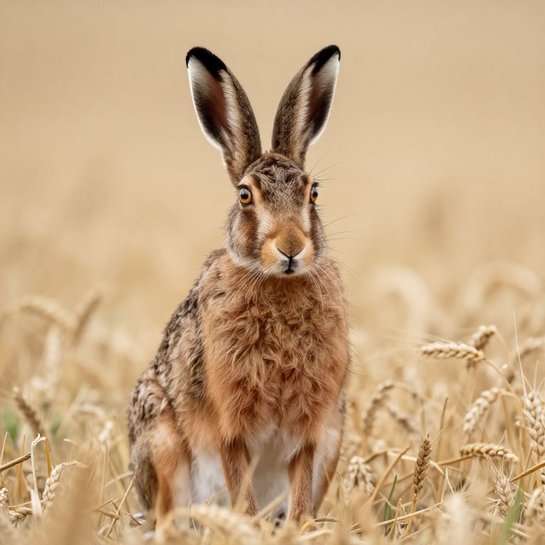 Brown hare sitting upright amidst golden wheat stalks, showcasing detailed fur textures and alert ears against a soft, neutral background.
