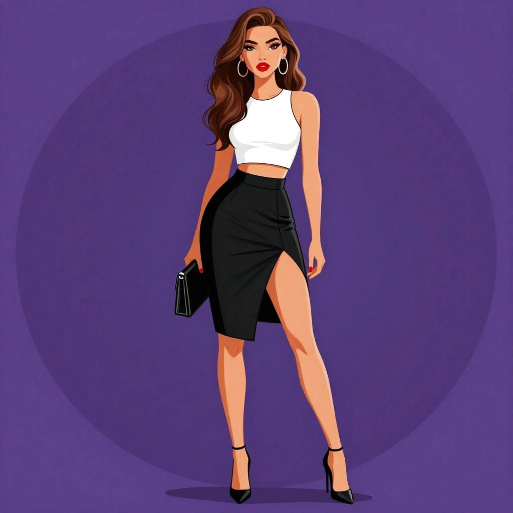 Illustration of a fashionable young woman with a pretty face and flowing brown hair, wearing a hot pink bandeau top with a center knot and a high-waisted black mini skirt featuring an asymmetrical hemline. She accessorizes with large hoop earrings and holds a black clutch, set against a solid purple background.