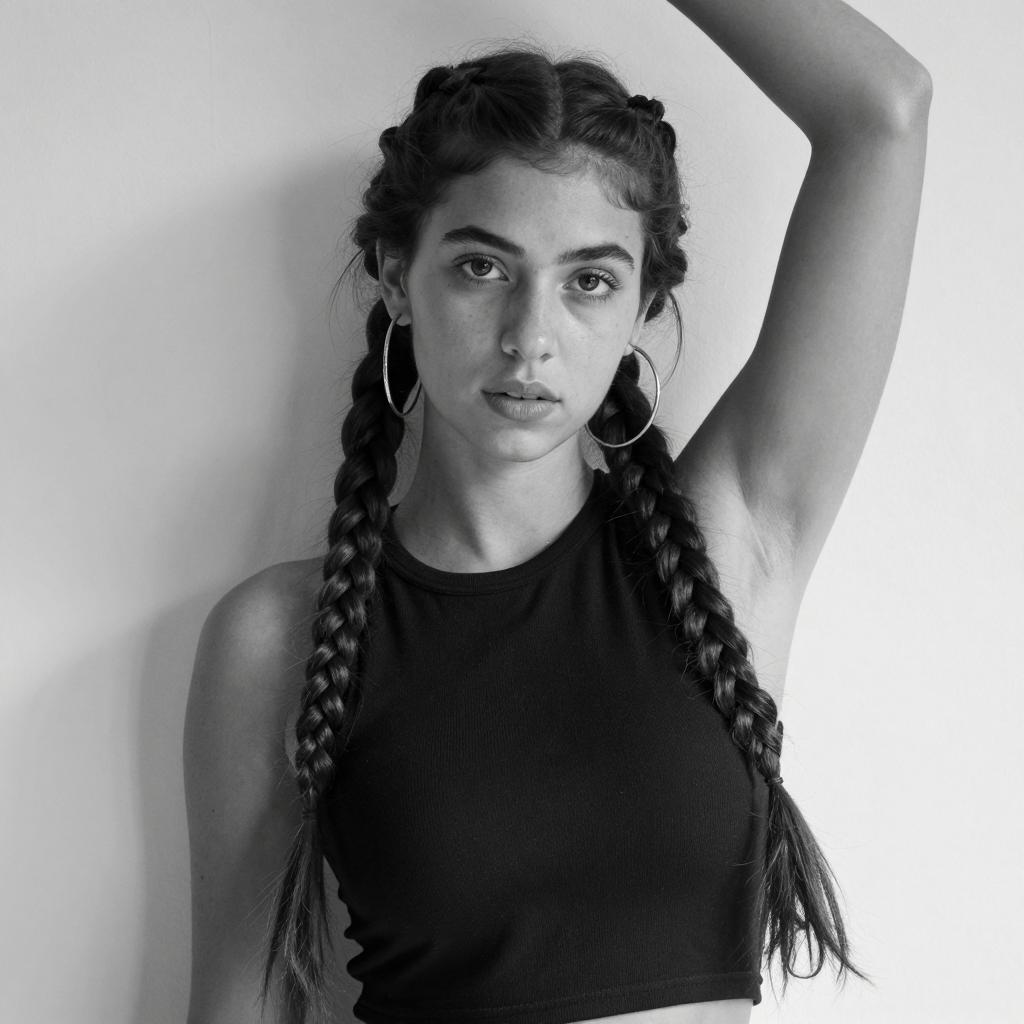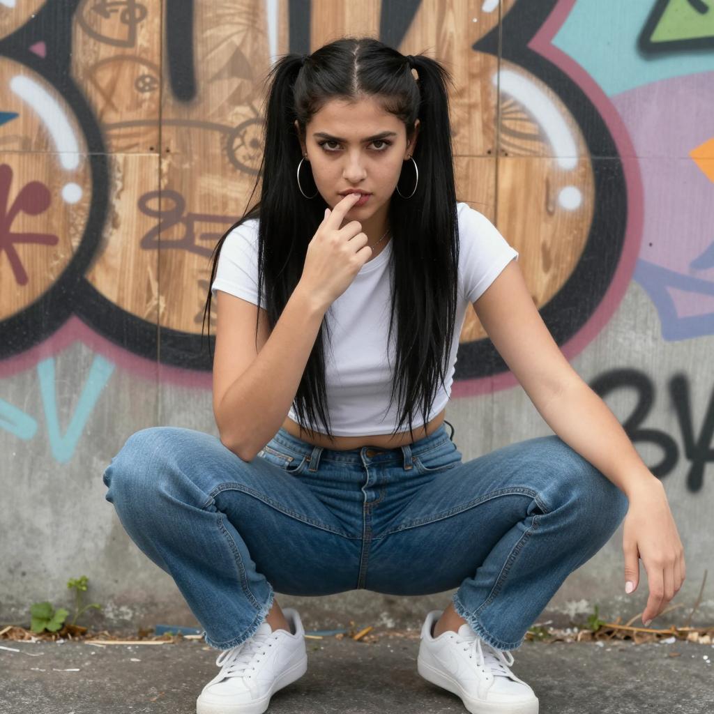 Young woman with long black hair styled in pigtails squatting in front of a wooden graffiti-covered wall. She is wearing a white crop top, blue jeans, and white sneakers, looking directly at the camera with an intense expression while biting her finger. The urban setting features colorful graffiti on a wood and concrete wall.