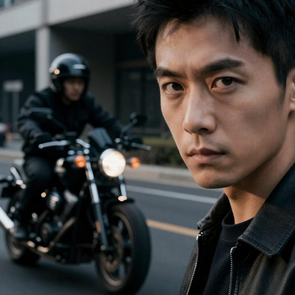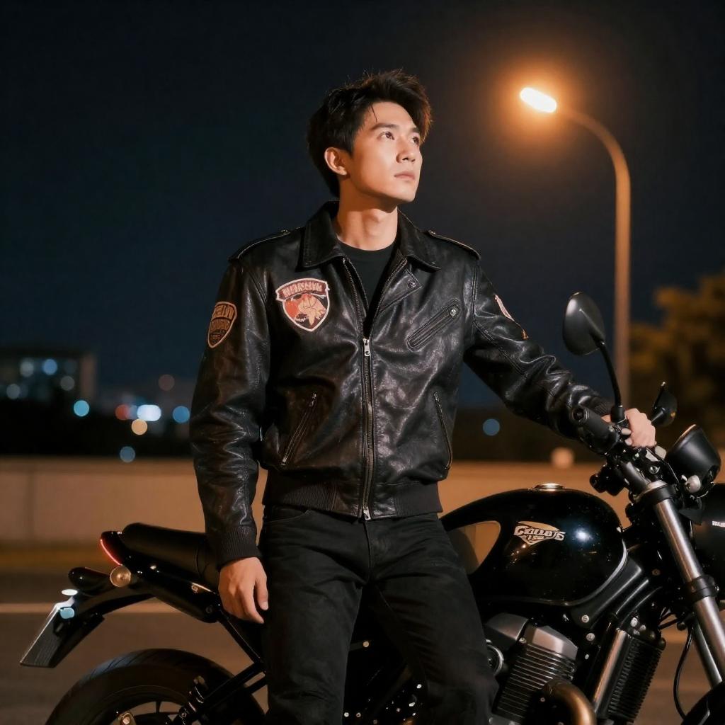 Young Asian man with short dark hair wearing a black leather jacket adorned with patches, standing next to a black motorcycle under warm streetlights at night. The motorcycle's front light is on, and blurred city lights are visible in the background.