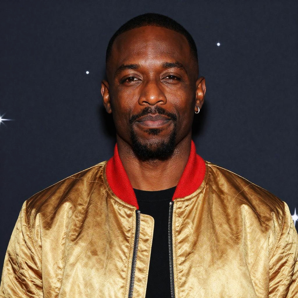 A photograph of a smiling Black man in a blue suit, white shirt, and striped tie, raising his right hand. He stands behind a gold podium with a large, circular emblem on a red curtain background. An American flag is on his right.