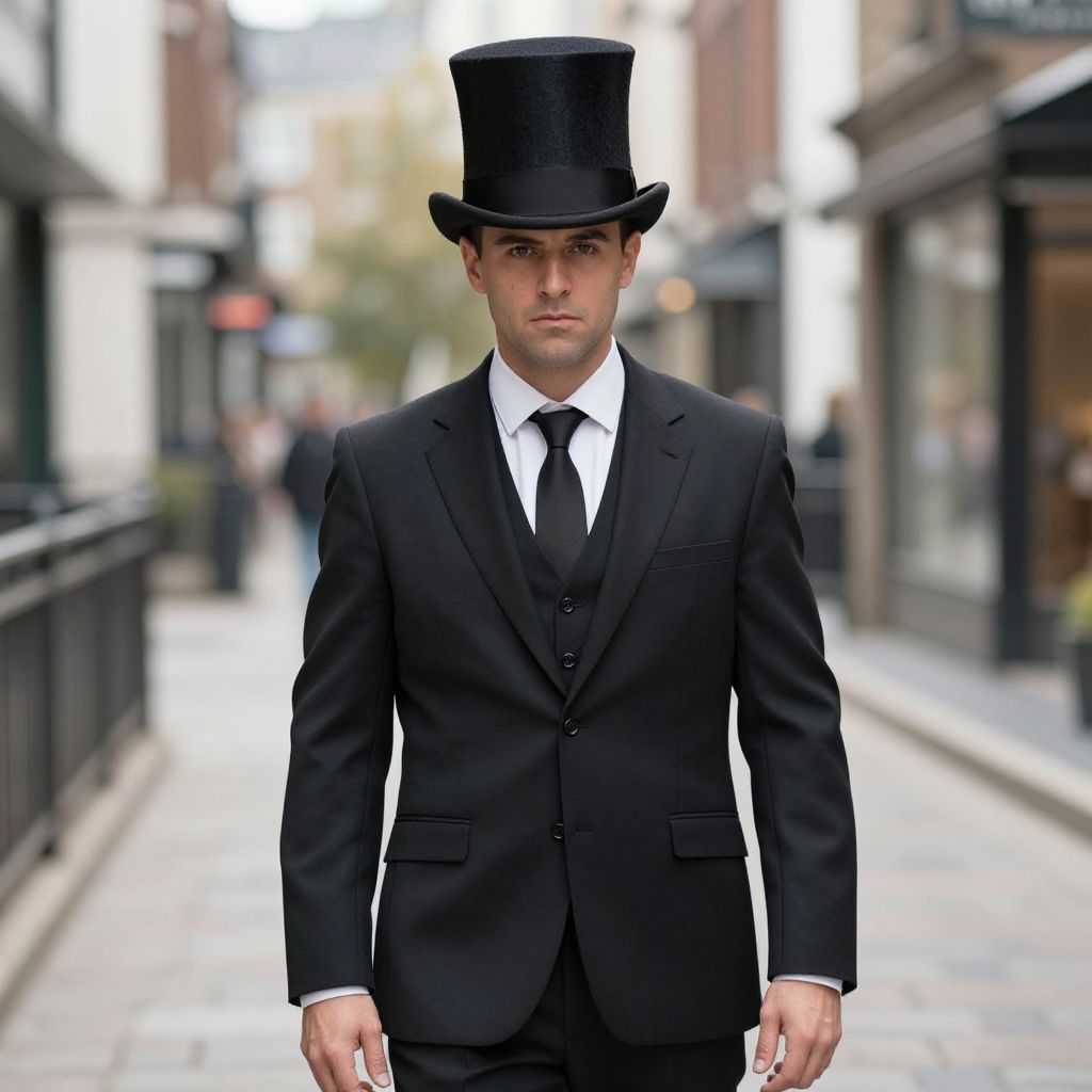 Black Top Hats Costume, man in a top hat and suit standing in a street