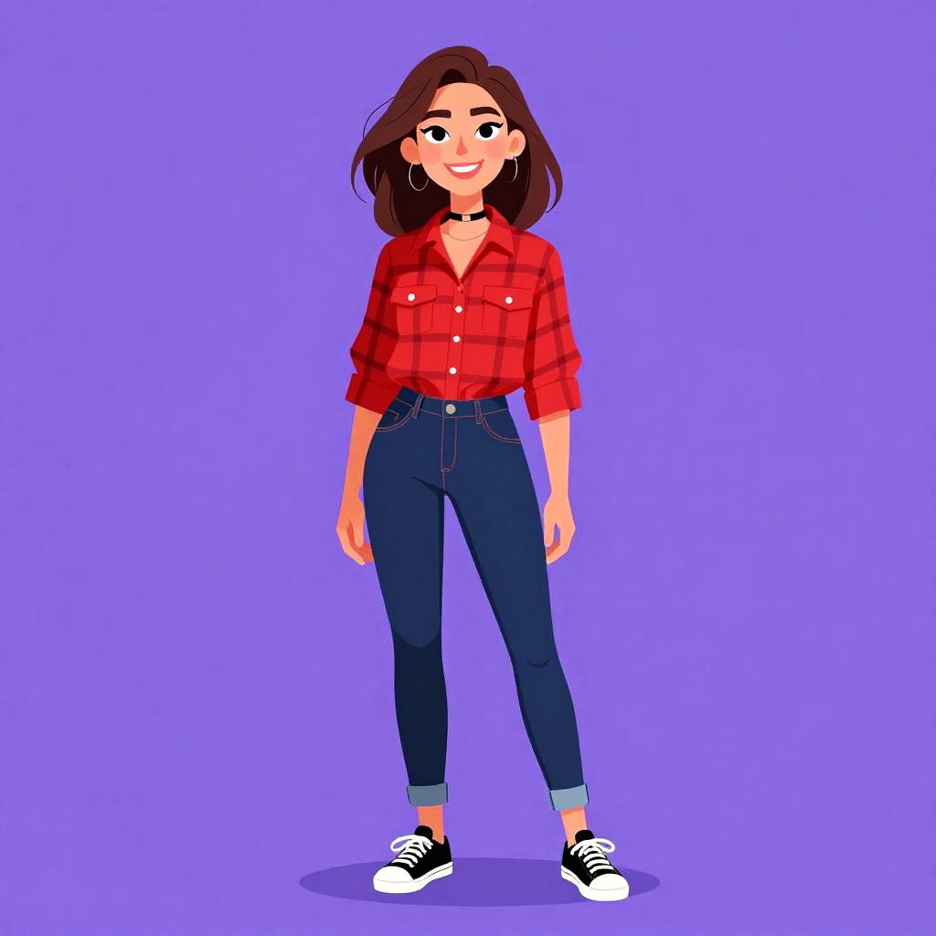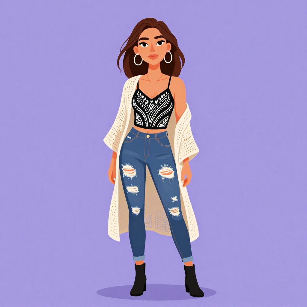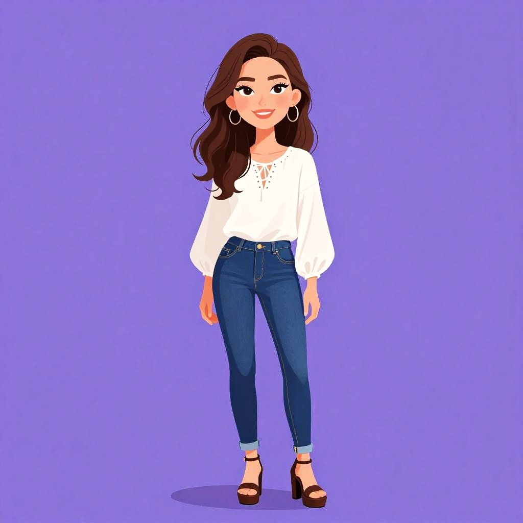Woman with pretty face and pretty hair. Woman, casual chic, cropped yellow sweater with voluminous short sleeves and ruched elastic neckline, white polka dot pattern, high-waisted light wash straight-leg jeans, black ankle boots with slight heel, simple studio background. --sref 1467