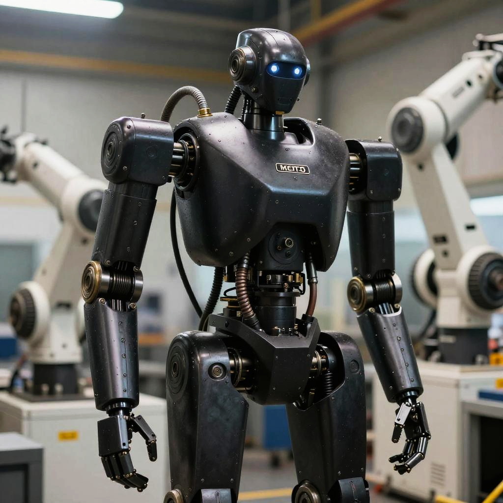 Portrait of highly detailed (black mechanical robot:1.2) soldier, hydraulics, wires, metal texture, in a white robot factory, cinematic photo, 35mm f/11 photograph, film, bokeh, professional, 4k, highly detailed