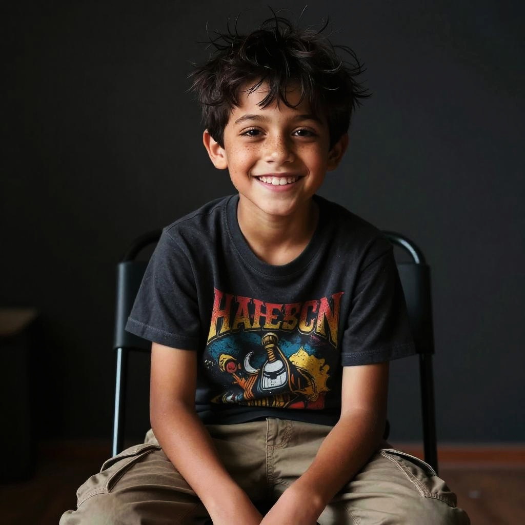A photograph of a young boy with dark, spiky hair and brown skin, sitting on a black chair against a dark, blurred background. He is smiling broadly, showing his teeth, and wearing a navy blue t-shirt with a colorful "Alice Cooper" graphic and beige pants. The lighting highlights his face and upper body, casting subtle shadows. His hands rest on his lap, and the chair's metal frame is partially visible. The overall mood is playful and cheerful.