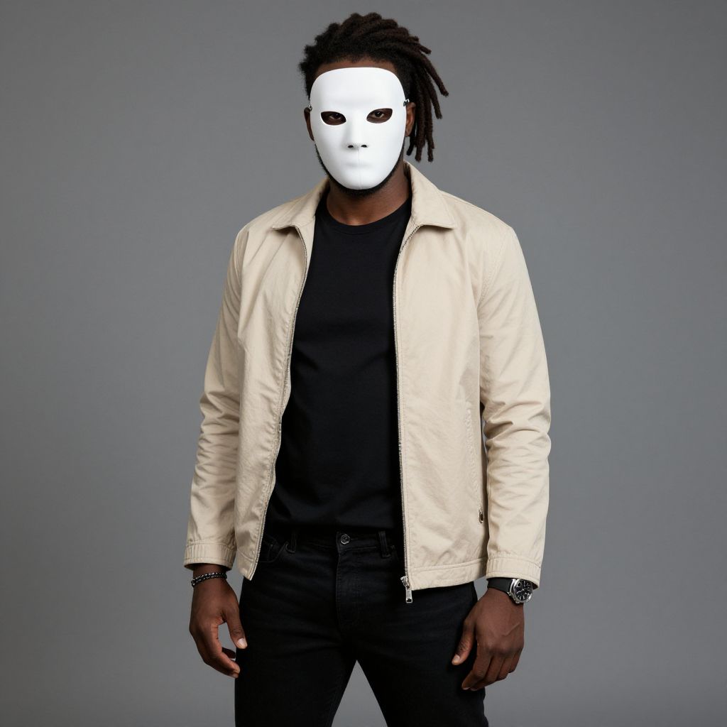 Man with a mask on his face and dreadlocks on his head. He is wearing a black t-shirt, black jeans, and a beige jacket. He has a watch on his left wrist and a bracelet on his right wrist.