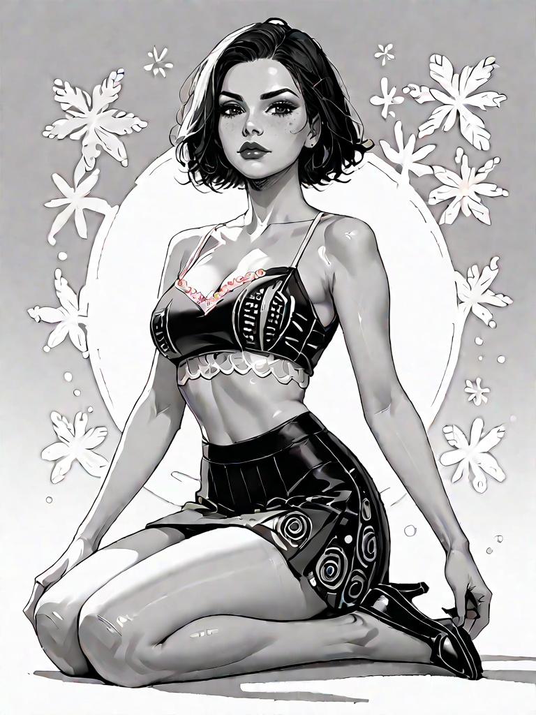 Black and white digital illustration of a woman with a realistic face and short dark hair, wearing a sleeveless black and white striped turtleneck top paired with high-waisted, frayed denim shorts and a wide belt. Full body shot with the woman posing confidently with hands relaxed by her sides.