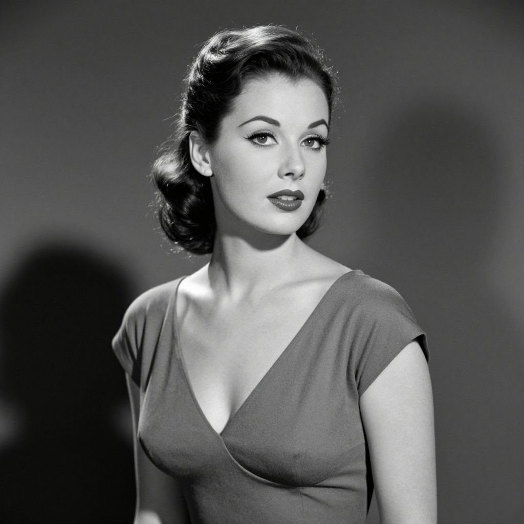 Black-and-white photograph of a 1950s-style woman with dark, wavy hair, wearing a V-neck dress, looking slightly to the side