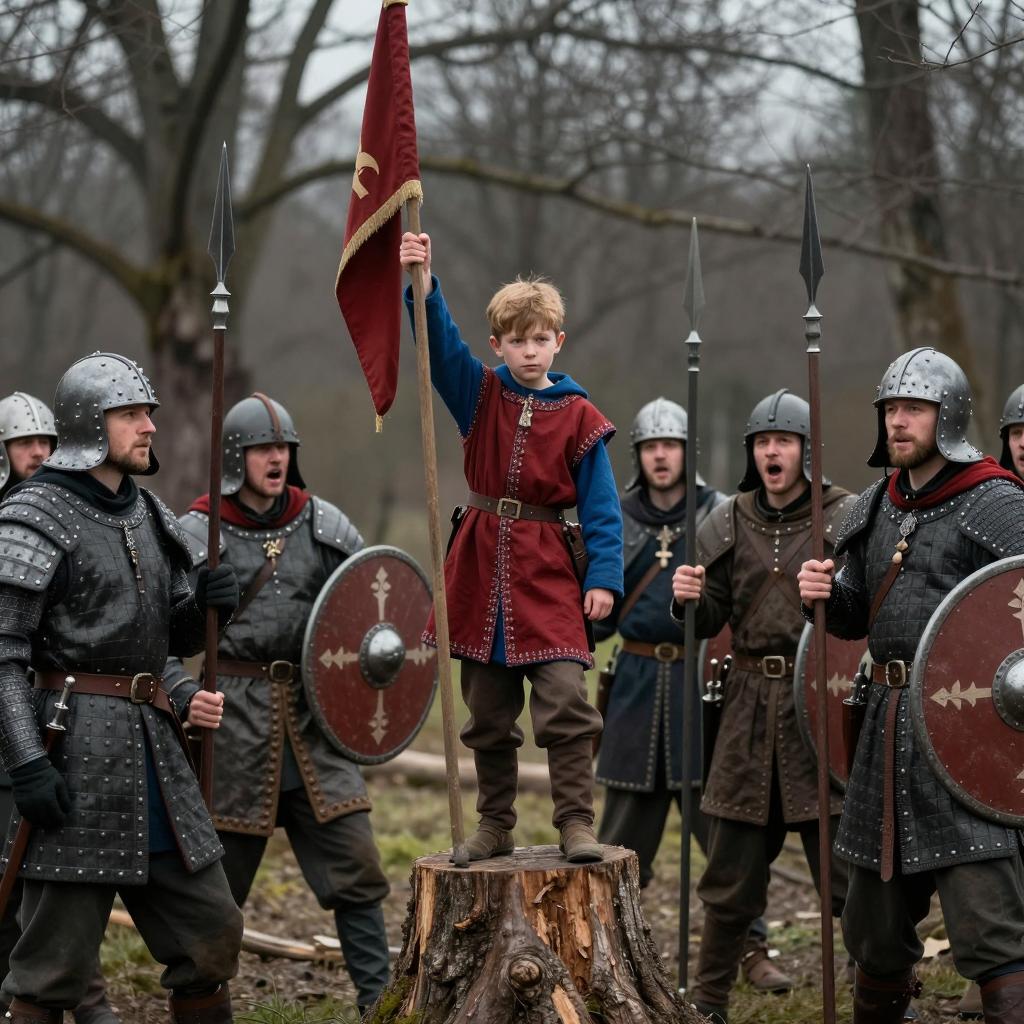 Battle scene with a young boy in a red and blue medieval-style tunic, standing on a tree stump, raising a flag. Surrounding him are armed men in varied military gear, holding spears and shields. Leafless trees in the background. 8 men visible, intense expressions, some shouting. Dark, muted colors. Visual style: realistic.