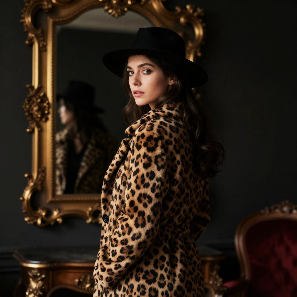 Woman in leopard coat and black hat, standing in front of ornate gold mirror, looking over shoulder. Dark background, gloomy lighting. Red velvet chair on right. She has light skin and minimal makeup. Her expression is neutral. Golden floral mirror frame.